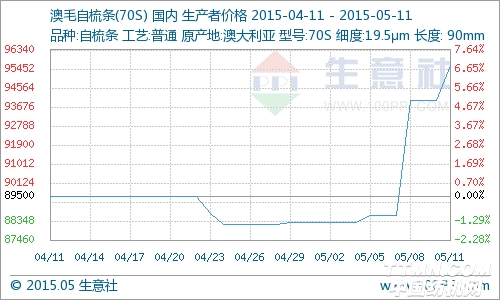 一.澳毛自梳条价格走势 据生意社数据监测显示:本周国内澳毛条受上游原材料带动,价格持续上调,其中70s澳毛自梳条价格大幅上涨,企价96000元/吨左右,于周初上调8.02%。 二.市场分析 本周国内毛纱市场成交量稍有微升,主要是备料因素带动,市场整体价格呈上涨的态势。江苏地区70s澳毛自梳条价格上调至96000元/吨左右,市场交易量偏稳。从下游针织横机开机情况看,由于毛纱的特定因素季节性强,目前毛纱市场淡气初显,在吴江横扇、嘉兴洪合、桐乡濮院等三地的生产运行开机率呈小幅下降态势,目前下游针织横机综合开机率90%左右。 三.后市预测 生意社分析师认为受上游原材料带动,澳毛条报价上浮,销售气氛相对好转,预计本周澳毛条价格维持坚挺。