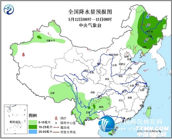 预报:5月12日08时至13日08时,新疆伊犁河谷和沿天山地区、东北地区、华南南部沿海等地的部分地区有小到中雨,局地大雨,上述局部地区并伴有短时 强降水等强对流天气。新疆南疆盆地等地有扬沙或浮尘天气。新疆北部、东北地区西部和南部、华北北部和西部、黄淮东部等地有5~6级风。