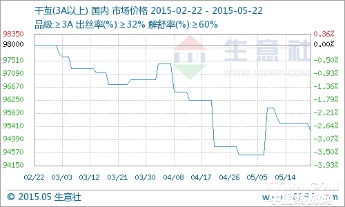 根据生意社价格监测显示,本周(5月18-22日)国内干茧市场行情呈继续小幅下跌态势,周跌幅在0.26%。目前干茧嘉兴地区价格在84000-91000元/吨左右,广西地区价格在100900- 101100元/吨左右。宜州市第三批蚕茧现已零星上市,预计大面积收购则在下周一。嘉兴市春蚕开始分批上簇,预计大批上簇将在5月23~24日。 国内生丝市场行情呈小幅下跌态势,周跌幅在0.83%,走势略为疲软,交投面持续清淡;下游观望情绪明显,而且受消费市场表现低迷影响,下方支撑力度不够。 生意社分析师认为,干茧市场成交依旧稀少,整体仍显疲态,随着国内蚕茧陆续上市,预计干茧价格将继续承压。
