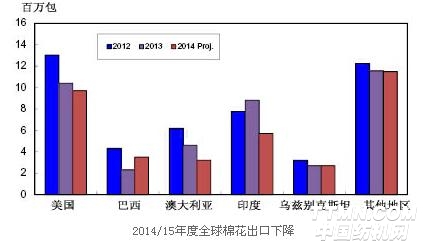 美棉出口取消的大概为970万包,2014/15年度出口预计占总数的72%。全球棉花贸易也在下降,美国占全球贸易预计增长27%。美国纺织厂使用棉花预计达到370万包,比2013/14年最终预算的360万包,高了3%。随着全球纺织厂使用量预计增长,美国棉纺织产品需求也将提高,因为全球经济形势的变化,消费者对棉制品需求增加。