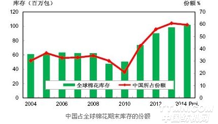 2014/15年度,全球棉花纺织厂使用量预计为11180万包,同比增长2%。中国和印度纺织厂的棉花消耗量大约超过6000万包,占总量的54%。中国预计增加4%的消耗量,3700万包,为近3年的最高。在过去几年中,中国的棉花价格高于世界价格,工厂减少使用棉花或者用进口纱线代替。然而,中国最近的政策可能会使棉纤维更具有竞争力,并可能提供刺激纺织厂使用棉纱的激励。