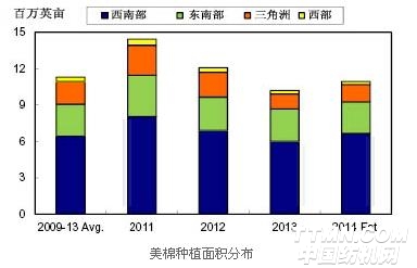 2014年,陆地棉种植将增长,长绒棉种植下降。在即将到来的年度,陆地棉种植面积在西南部和三角洲地区预计扩大,在东南部和西部地区略有下降。西南部陆地棉种植面积预计接近670万英亩,同比上涨但低于2011和2012年(图二);占总种植面积的61%,为1920年以来的最高。三角洲地区有望增长17%的种植面积,约140万英亩,但仍为历史低点,该地区种植面积预计占总数的13%。在东南部地区,棉花种植面积约为260万英亩,与上年度相近,低于近10年平均水平。东南部地区约占总面积的24%。西部地区由于灌溉问题,仅仅有24.5万英亩的种植,仅占全部的2%。长绒棉种植在西部地区大大增长。