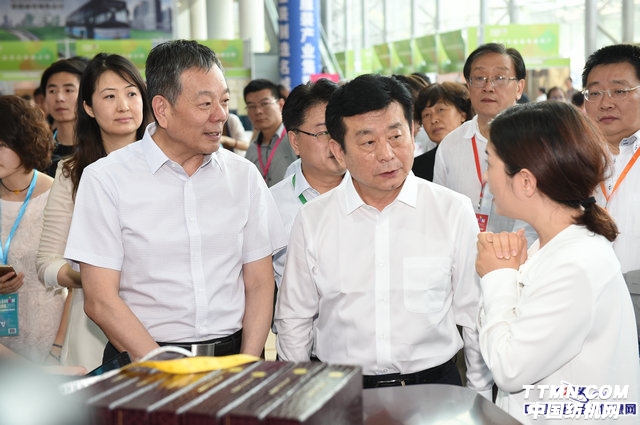 山东省副省长于晓明(中)与中国纺织工业联合会副会长杨纪朝(左一)在参展商红领集团酷特展位