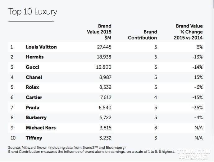 该报告主要从公司收入、潜力以及品牌的延伸价值,包括品牌独特性、特点,对消费者的吸引力来比较奢侈品牌。Millward Brown列举了排名前10的奢侈品牌,Louis Vuitton、Hermès、Gucci、Chanel、Rolex、Cartier、Burberry、Michael Kors、Tiffany榜上有名。