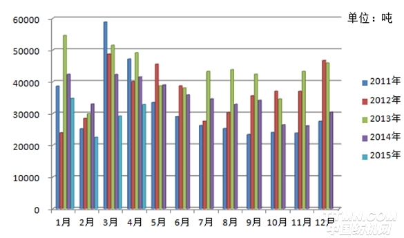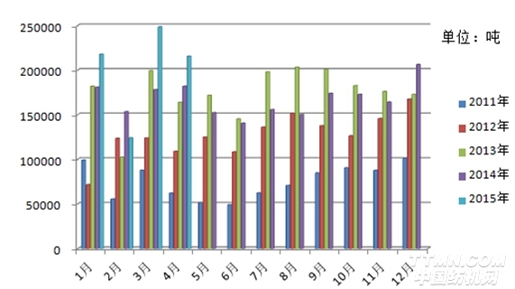 由图1可见,每年我国进口棉纱数量会在3-5月和8-9月这2个传统纺织旺季达到高峰。2015年1-4月我国棉纱进口数量再创新高,不断增加的棉纱进口数量和进口棉纱关税有望降低的消息是否会推动棉纱进口量再创新高?