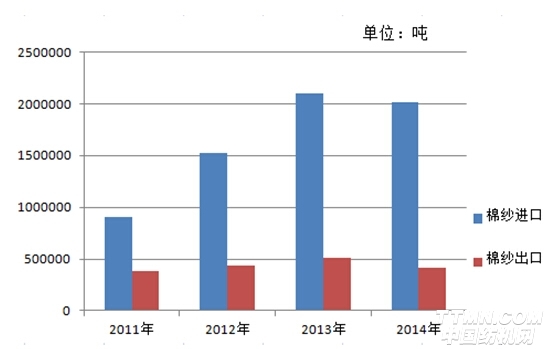 2011-2014年棉纱进口呈波动增长态势,2011年我国进口棉纱90.2万吨,2012年棉纱进口量骤增至152.6万吨,同比增长69.2%;2013年进口棉纱209.8万吨,同比增长37.5%;2014年进口棉纱201.1万吨,由于中国纺织市场不景气,同比下降4.2%。