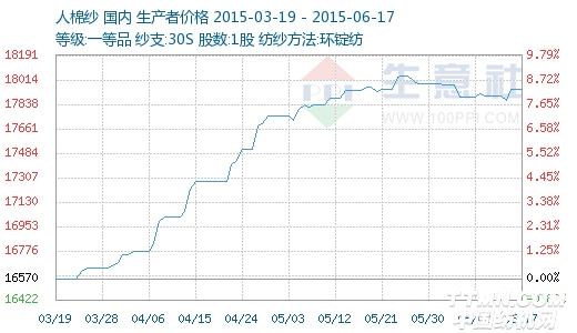 一.人棉纱价格走势 6月16日人棉纱商品指数为87.56,与昨日持平,较周期内最高点101.14点(2013-03-07)下降了13.43%,较2014年11月26日最低点79.84点上涨了9.67%。(注:周期指2012-09-30至今) 二.市场分析 6月17日,国内人棉纱订单表现清淡,淡季特征明显,市场上环锭纺走货偏弱,赛络纺也表现一般。现环锭纺30s现金报价为17600-18200元/吨。赛络纺40s在20300-20500元/吨。上游粘胶短纤延续平稳,高端因部分厂家供应减少,及部分厂家销售模式转变,总体供应量有所偏紧,价格则基本坚挺在12700-12800元/吨,个别偏低货源在12600元/吨。 三.后市预测 本周人棉纱厂家维持刚需补货采购,但多以小量为主。因上游棉浆市场局部试探性拉涨以及适逢下游纱厂补仓,后市行情大稳小动。