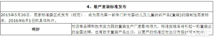 对此,2015年国家和地方积极推出了各项政策和标准,一方面为纺织行业阵痛期转型升级添砖加瓦,另一面在纺织业面临深度调整背景下,各项严厉标准的出台也不失为加速纺织行业清理洗牌的关键。