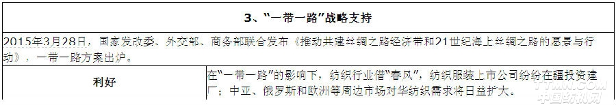 纺织品出口退税上调以及进口纺织品及服装类关税下调,对于促进外贸出口和刺激国内消费,拉动需求具有重要作用,再次成为提振纺织服装行业的新信号和正能量,而“一带一路”的战略支持,也为企业拓展新的发展空间指明了方向。