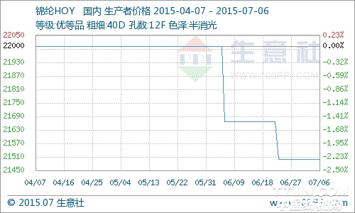 7月6日,福建地区锦纶HOY40D/12F目前报价在22000元/吨,价格较往前一样,下游市场走货不畅,厂家开工有所下降。据生意社锦纶HOY监测,受原料市场及下游影响,最近三个月锦纶HOY市场价格呈跌势。原料市场价格再次上涨,锦纶丝受下游影响走货不畅,厂家跟涨意识较强。