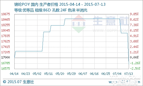 7月13日,浙江地区锦纶POY86D/24F价格在17800元/吨,价格较上周一样。原料市场价格坚挺,近期交易情况不太理想,切片价格较为稳定。 据生意社锦纶POY价格监测,受原料市场及下游影响,最近三个月锦纶POY一直维持下跌态势。目前原料市场价格暂稳,厂家开工情绪一般,多在8成左右,预计短期内价格暂稳。