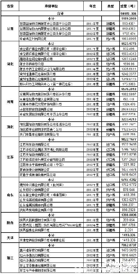 定于7月16日出库销售储备棉50972.391吨。其中2012年度国产棉14617.9532吨(最低起拍价12790元/吨,捆号47500112513),2012年度进口棉18636.6116吨(最低起拍价13980元/吨,捆号分别为31450112021和31420012037);2011年度国产棉17717.8262吨(最低起拍价10760元/吨,捆号71510111286)。相关批次公检数据见附件。具体库点如下: