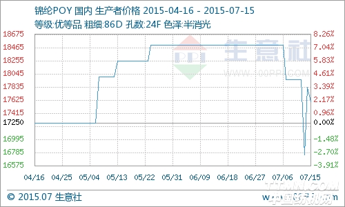 8月5日,福建地区某厂家锦纶POY86D/24F价格在17300元/吨,价格较上周下调500元/吨。原料市场价格最近小幅回落,给厂家压力减弱,下游购买情绪不佳,市场信心仍不足。 据生意社锦纶POY价格监测,受原料市场及下游影响,最近两个月锦纶POY一直维持下跌态势。目前原料市场价格再次提升,下游纺丝成交量有限,短期内价格或有所调整。