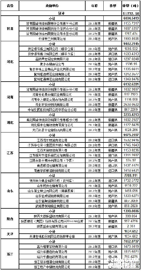 定于7月20日出库销售储备棉51772.5758吨。其中2012年度国产棉14371.0412吨(最低起拍价12790元/吨,捆号47500112513),2012年度进口棉18636.6116吨(最低起拍价13980元/吨,捆号分别为31450112021和31420012037);2011年度国产棉18764.923吨(最低起拍价10740元/吨,捆号30000211323)。相关批次公检数据见附件。具体库点如下: