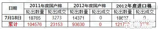 7月20日储备棉轮出数量为51772.5758吨,实际成交3273.0006吨,成交比例6.32%。当日成交均为2011年度国产棉,平均长度28.8,参与涉及竞买成功的企业共计14家。据中国棉花信息网统计,截至7月20日储备棉轮出累计成交26823.7346吨,成交比例8.38%。