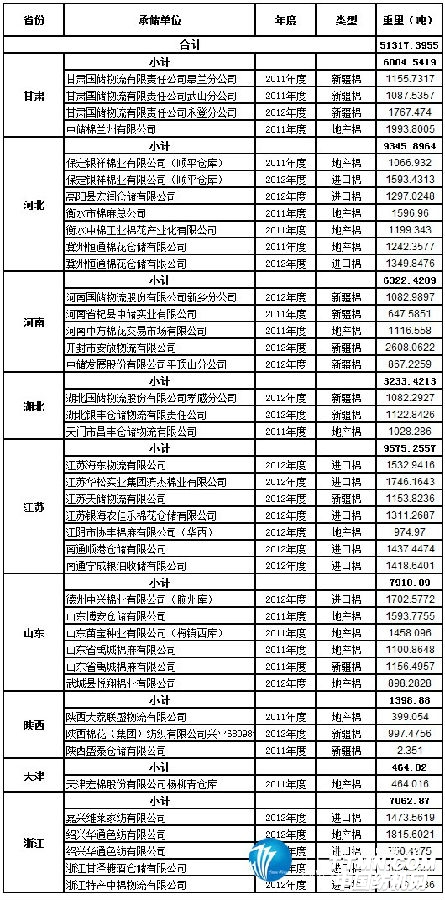 定于7月21日出库销售储备棉51317.4吨。其中2012年度国产棉14371.0412吨(最低起拍价12790元/吨,捆号 47500112513),2012年度进口棉18636.6116吨(最低起拍价13980元/吨,捆号分别为31450112021和 31420012037);2011年度国产棉18309.7427吨(最低起拍价10780元/吨,捆号30000211325)。相关批次公检数据见 附件。具体库点如下: