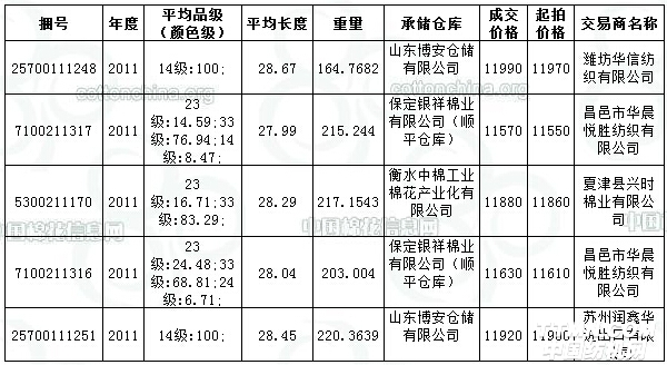 一、最高成交价11990元/吨,共计164.7682吨,承储在山东博安仓储有限公司(2011年度国产棉)。最低成交价11570元/吨,共计215.2440吨,承储在保定银祥棉业有限公司(顺平仓库)(2011年度国产棉)。