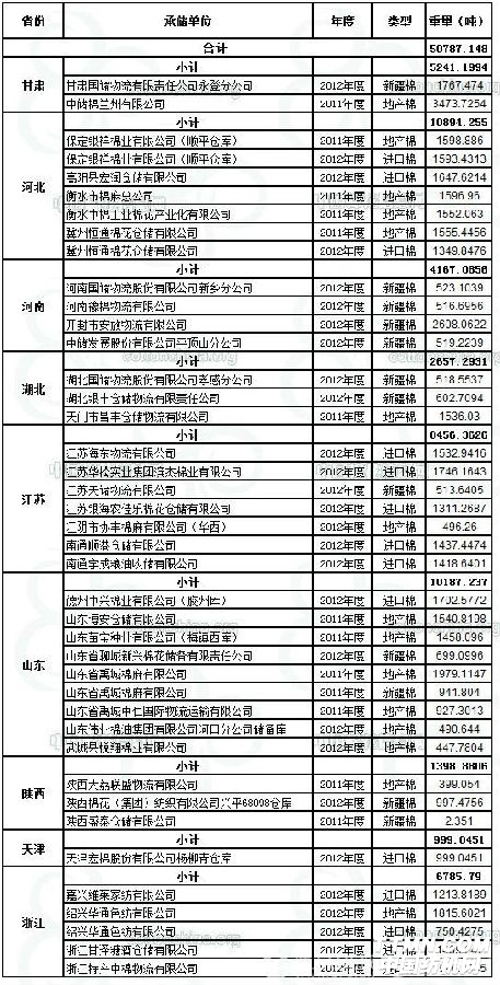 定于8月3日出库销售储备棉50787.1483吨。其中2012年度国产棉12516.3249吨(最低起拍价12790元/吨,捆号47500112513),2012年度进口棉19709.1726吨(最低起拍价13560元/吨,捆号分别为30000212104);2011年度国产棉18561.6508吨(最低起拍价11660元/吨,捆号05300311364)。相关批次公检数据见附件。具体库点如下: