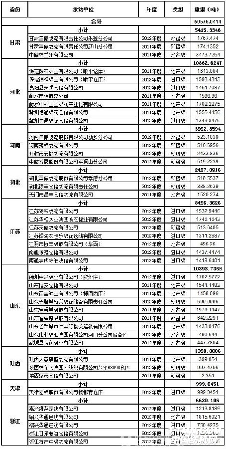 定于8月10日出库销售储备棉50576.0414吨。其中2012年度国产棉12127.6532吨(最低起拍价12790元/吨,捆号47500112513),2012年度进口棉19357.5759吨(最低起拍价13560元/吨,捆号分别为30000212104);2011年度国产棉19090.8123吨(最低起拍价11600元/吨,捆号43170011462)。相关批次公检数据见附件。具体库点如下: