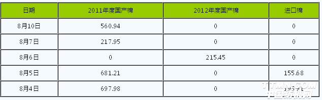 8月10日,中国储备棉管理总公司计划挂牌轮出储备棉50576.04吨,实际成交560.94吨,成交率1.11%,为2011年度国产棉。