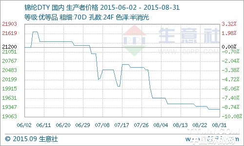 据生意社价格监测显示,8月国内锦纶丝市场总体呈下行缓慢态势,当前价格在18500元/吨,较月初19000元/吨,下跌-1.07%,8月上旬整体持平,从8月中上旬开始跌势有所放缓,开始进入震荡期,从8月下旬开始价格一直继续持平。 国内主流生产商70D/24F月初锦纶丝报价19000元/吨,月末报价在18500元/吨,下跌-1.07%。市场成交重心清淡,锦纶丝市场依旧弱势,锦纶主流工厂开工率在5-6成。 上游利空占主导下,己内酰胺短期延续弱势,预计今日液体料主流价格在10400-10500元/吨承兑送到。下游需求缩量明显,场内成交情况清淡有加,锦纶丝市场利空主导,短线暂无明显好转迹象,业者多谨慎操作,对后市观望心态不减。 据生意社分析师认为,预计后期锦纶丝整体市场或平稳稍弱,后期传统产销淡季氛围继续蔓延,终端订单的继续缩量加之资金压力的持续困扰或使得下游需求难有明显改善,预计后期锦纶丝市场产销均有下滑,锦纶丝价格调整更为谨慎,虽然跌势或有所放缓,但依旧摆脱不了稳中趋弱的局面。