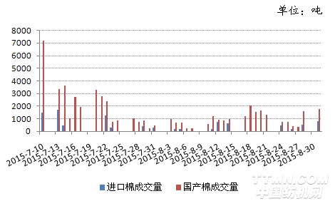 从期货市场观察,自储备棉轮出工作开展以来,皮棉市场供应越发充裕,在供大于需的行情背景下,棉花期货价格一路走低。8月31日,郑棉主力合约CF1601收盘价格12360元,较7月1日下跌近1000元,郑棉期货价格持续下跌,致使纺企对后市棉价担忧加重,不敢大批量采购,并且低价仓单棉吸引部分纺企接手,抑制储备棉成交。