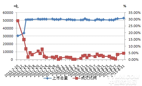 截至2015年8月31日,2014年度储备棉轮出工作圆满结束,本次轮出近两个月时间,总计划轮出量为185.47万吨(每日挂牌累计数量),实际成交6.34万吨,总成交率3.42%,其中2011年度国产棉共成交5.27万吨;进口棉成交0.97万吨;2012年度国产棉因价格过高,质量一般,总成交量不足1000吨。由成交情况来看,每日成交率由首日的28.74%迅速下降到5%以下,最高成交价格为15890元/吨,最低成交价格为10780元/吨,整体成交量低位徘徊,在下游订单不旺,棉纱利润微乎其微,新棉即将上市的情况下,纺企对皮棉采购越发谨慎。