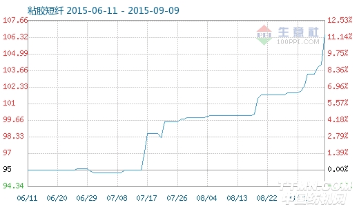 9月8日粘胶短纤商品指数为106.55,较上一日上升了2.43点,创下周期内的历史新高,较2015年03月19日最低点86.73点上涨了22.85%。(注:周期指2013-09-01至今)