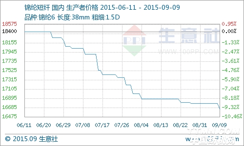 据生意社价格监测,9月9日,国内锦纶短纤市场价格走势近期持平,国内主流生产厂商1.5D*38mm短纤报价在16000-16500元/吨之间,价格较上周下调500元/吨,高价货源成交寥寥,重心偏低端。