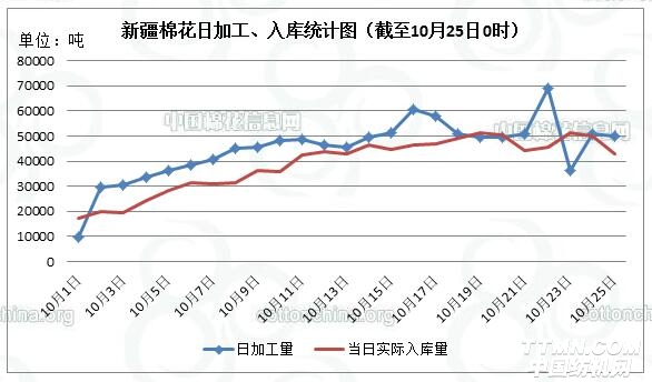 近期新疆地区日加工量均维持在5万吨左右,期间受到雨雪天气影响进度有波动,周进度上看较(截至10月18日的一周)有微幅下降。入库进度上并未受到太大影响,整体入库较(截至10月18日的一周)有所增加。根据全国棉花交易市场新疆棉花专业仓储进度表最新统计,截至10月25日0时,累计加工量已达到128.98万吨,累计入库量105.05万吨,相较上年度同期有大幅提升。