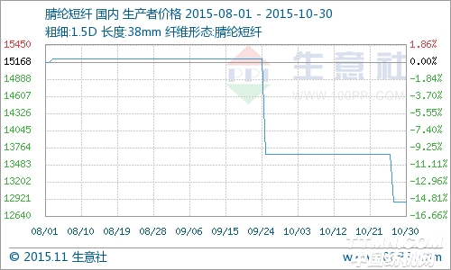 根据生意社价格监测显示,截止10月30日,国内1.5D*38mm腈纶短纤价格整体下调800-1000元,报至12850-13050元/吨,较10月初挂牌价跌幅5.68%,市场利空气氛有所释放。行业开工水平不低,市场供应仍较充裕。下游需求一般,且买盘心态观望。截止收盘,上海石化1.5D短纤报至13100元/吨,3D短纤报至13150元/吨;安庆石化1.5D短纤报至12850元/吨,3D短纤报至12900元/吨;齐鲁石化1.5D短纤报至12400元/吨,3D短纤报至12450元/吨。 腈纶上游领域丙烯腈市场稳中偏好运行,厂家库存偏低,整体供应略紧,商家持货量不多,报价相对坚挺,目前市场主流商家报价在7500-7900元/吨之间。下游腈纶纱线市场窄幅整理,毛纱出货情况尚可,全腈纱需求偏弱,整体交投气氛不强,纱厂开工情况一般,原料按需采购为主。32S棉型单纱报至19500-20000元/吨,实盘商谈为主。 外盘丙烯腈价格继续下跌,腈纶商谈也跟随下调,但内外盘倒挂,以及下游纱厂对国内腈纶后市下跌预期仍存,采购积极性普遍不高。 生意社分析师汪文煜认为虽然国内腈纶价格再改下跌无法避免,但上游成本面的支撑对抑制腈纶市场的跌势起到一定作用,加上腈纶纱订单量跟进一般,纱厂多持谨慎观望心态,预计腈纶市场月初挂牌价格暂稳。