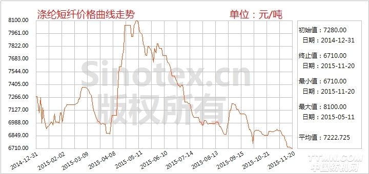2015年11月上中旬,涤纶短纤价格由盘整状态转为阴跌格局。上旬,油价大涨大落,间或提振原料,聚酯大盘气氛尚可,涤纶短纤价格延续1个多月来盘整态势,江浙1.4D直纺涤纶短纤主流报价6900-7000元/吨(出厂)附近窄幅波动。厂家稳价走货意向为主,询盘销售短暂好转。中旬,随着油价持续下跌,聚酯大盘气氛暗沉,涤纶短纤报价摆脱盘整局面,重入阴跌通道。涤纶短纤厂家报价累计下调250元/吨左右,江浙1.4D直纺涤纶短纤主流报价跌至6650-6750元/吨出厂。11月20日,受两套PTA装置公布检修消息刺激,聚酯大盘整体气氛稍有回升,但涤纶短纤反应仍淡,报价稳定,下游观望为主,拿货谨慎。下周PTA行业开工负荷低位,成本支撑相对坚挺,但涤纶短纤厂家高库存下,若无明显利好提振,价格企稳回弹略有难度,信心略不足或僵持盘整。 11月20日统计,1.4D直纺涤纶短纤价格累计下跌235元/吨至6660元/吨,跌幅3.41%,再创年度新低。价格仍运行在7000元/吨整数位之下(见表一),比当日国内3128B级棉花现货价格指数低6296元/吨,价差较上月扩大202元/吨。江浙1.4D直纺涤纶短纤主流报价6650-6750元/吨出厂;福建1.4D直纺涤纶短纤主流报价6650-6700元/吨短送;山东、河北1.4D直纺涤纶短纤主流报价6750-6850元/吨送到,实际成交均可商谈。当日,涤纶短纤开工实时负荷61.9%,主流厂家库存18-24天,甚至有负库存有听闻。涤纶短纤现金流-50元/吨附近。表一 化纤原料价格运行明细表 单位:美元/桶、元/吨、美元/吨项目/日期 纽约原油期货 PX台湾 MEG内盘 PTA内盘 聚酯切片 涤纶短纤 棉花3128B10/30/2015 46.59 805 5045 4655 6200 6895 1298911/02/2015 46.14 772 5070 4710 6250 6855 1297911/10/2015 44.21 808 5030 4680 6225 6830 1297211/16/2015 41.74 790 4800 4665 6075 6840 1294211/20/2015 40.39 800 4690 4665 5975 6660 12956涨、跌总量 -6.20 -5 -355 10 -225 -235 -33±幅度(%) -13.31 -0.62 -7.04 0.21 -3.63 -3.41 -0.2510月涨、跌量 1.50 27 -55 215 375 125 -62±幅度(%) 3.33 3.47 -1.08 4.84 6.44 1.85 -0.48 原料方面,纽约原油期货、亚洲PX和聚酯切片价格均止涨下跌;MEG内盘现货价格扩幅续降;唯PTA内盘现货价格在装置检修利好支撑下维稳。 11月以来,纽约油价止涨超大幅下跌。12月原油期货价格累计下跌6.2美元(-13.31%)至40.39美元/桶。月初(11月3日),对利比亚和巴西的供应中断问题感到担心,帮助油价大涨近4%至47.90美元/桶月度高位。此后,供应过剩的忧虑阴魂不散导致油价一路下跌为主。11月4-20日期间,纽约油价有13日下跌。利空因素有:美国原油库存连续7周增长,且美国活跃原油钻探平台数量11周来首次增长;美元汇率上涨及美联储在12月政策会议上加息预期的打压;中国制造业采购经理人指数(PMI)及10月外贸出口数据表现不佳,引发的需求担忧。11月20日,12月原油期货价格跌至40.39美元/桶月度低位。11月16日,由于有消息称欧佩克(OPEC)的产量连续第3个月出现下降,及法国对叙利亚发动空袭,地缘政治危机引发有关中东地区原油供应担忧,原油期货价格上涨1美元,报收于41.74美元/桶,涨幅2.5%。但随后油价仍由供过于求的基本面主导。 亚洲PX价格整体走势跟随原油价格下行,但后期有所反弹。价格累计下跌5美元至800美元/吨。 近2个月以来PTA工厂装置检修较为集中,使得PTA开工率降至较低水平,PTA现货市场维持供应偏紧局面,支撑现货价格坚挺。11月以来,PTA现货虽价格未能延续上涨之势,但在国际油价及聚酯原料市场低迷下滑态势下行情“一枝独秀”,价格维持稳定。10月25日按计划停车检修逸盛大化375万吨PTA装置,因关键设备故障,未能如期开车。11月20日,东北一套220万吨PTA装置因故障临时停车,重启时间未定;华东一套150万吨PTA装置因故障从20日晚起停车检修,重启时间未定;由此导致国内PTA装置实时开工率下降至57.5%,对应目前75.6%附近的聚酯开工率(以产能4636计),PTA略处于去库存的状态中。受装置检修消息影响,PTA期货及内盘市场低端商谈重心上扬,部分现货买盘意向提升至4650元/吨自提以上,高端仍在4720元/吨附近。由于PTA社会库存偏低,且珠海BP110万吨装置计划11月下旬停车检修,加之供应商力挺现货价格,这对PTA期价形成一定支撑。但上游PX跟随原油下行,成本端压制PTA价格。终端聚酯压力较大,价格下跌亏损加大,库存增加,对PTA刚需为主,部分地区装置因环保短暂下调开工或停车,消费端将对PTA形成拖累。PTA目前生产已有利润,后期负荷若回升将成为潜在利空。目前,PTA行情依然由成本主导,原油价格波动将影响短期PTA价格。 MEG内盘现货价格大幅走弱,跌破5000元/吨整数关,累计下跌350元/吨左右,现货报盘跌至4520-4530元/吨附近,买方还盘4500元/吨略偏内,商谈成交4500-4520元/吨,当前12月货已有报盘在4480元/吨。 聚酯切片价格止涨下跌235元至5975元/吨,跌破6000元/吨整数位。江浙半光切片下游多数观望,成交较少。11月20日,在PTA期货受装置检修消息刺激大涨带动下,江浙半光切片成交气氛明显回升,个别厂家商谈提升50元/吨,200-400吨中单成交在5700元/吨现款附近,局部亦有少量5750-5800元/吨现款的成交出现。表二 2015年11月份涤纶纱线、坯布价格运行明细表 单位:元/吨、元/米日期 项目 T 32s T 45s T65/C35 32s T65/C35 45S T65/C35 45x45 110x76 63" 涤细10/30/2015 11020 12100 14700 17440 4.49 11/02/2015 11000 12100 14700 17420 4.49 11/10/2015 10850 12100 14700 17380 4.48 11/16/2015 10695 11900 14700 17300 4.476 11/20/2015 10570 11700 14500 17260 4.475 涨、跌总量 -450 -400 -200 -180 -0.015 ±幅度(%) -4.08 -3.31 -1.36