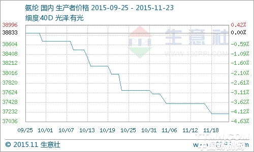 根据生意社价格监测显示,截止到11月20日,国内氨纶市场延续弱势整理行情,目前40D氨纶主流报价在32000-38000元/吨左右,较11月初跌幅1.06%,其他规格如20D报价在42000-48000元/吨左右,30D报价在36000-43000元/吨左右。因需求偏低导致下游成品出库阻力增大,而进入下游织造业的订单量也有下降趋势,厂家生产积极性一般,同时接近年末,部分织造厂开始回笼资金,主动减少部分利润偏薄的订单的接单量,从而导致织造业整体开工负荷难有起色,对原料氨纶的采购量表现疲软,较多氨纶厂家库存量缓慢上升,但是因目前价格已近低位,氨纶厂家报价多持稳为主,不过实际走货仍不乏大单现款灵活出货。 氨纶上游领域纯MDI市场盘整运行,部分厂家控量销售货源偏紧,贸易商报价相对坚挺,下游市场整体表现一般,需求量有限,短期内保持平稳整理,个别大单有商谈空间。截至到目前,华东地区拜耳货源商谈在14100-14500元/吨,低端现款,高端承兑。 下游织造领域厂家开工率较低,订单量有所下滑,圆机企业整体开工负荷维持在较低水平,包纱领域生产积极性受到压制,短期内订单及库存生产需求尚可持续,经编市场在终端平布产业成本出库情况较好下,对氨纶原料消耗稳定,目前整体负荷6-7成。 生意社分析师认为临近年末,下游回笼资金需求较强,开工负荷相应下降,整体对氨纶需求放缓,导致氨纶价格长期低位运行,预计后期氨纶市场持续淡稳运行,40D氨纶价格僵持在32000-38000元/吨左右。