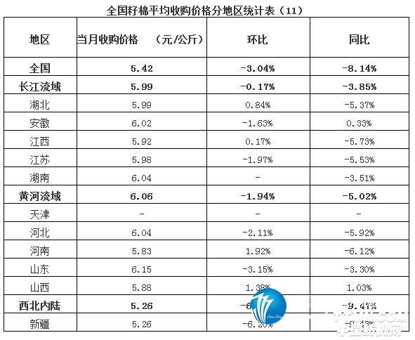 11 月,部分棉区收购进入尾声,籽棉收购价格普遍下跌,上市籽棉以霜后花为主,低等级籽棉占比增加,质量较前期有所下降。新疆棉区收购进度加快,月底收购已近 尾声,内地棉区因棉花面积产量大幅缩减、收购企业明显减少,收购量下降,进度相对较慢。根据中纤局棉花公检统计数据,截止11月30日,全疆400型的棉 花加工企业近100%入市收购,其中送检企业已达739家(含兵团),占全疆总数的90%以上,送检量达到256万多吨,同比增加了28万多吨。 一、籽棉收购量、质、价齐跌 11 月,新疆棉区籽棉收购进入尾声,内地部分产棉省进入中后期。大部分棉区出现不同程度的降雨、降雪等不利天气,因此本月籽棉霜后花、僵瓣棉增多,颜色级、马 值、衣分率较前期下降,收购价格下跌。全国400型棉花加工企业3128级籽棉平均收购价格为5.42元/公斤,环比下跌0.17元/公斤,跌幅 3.04%,同比下跌0.48元/公斤,跌幅8.14%。其中,新疆棉区月均收购价格为5.26元/公斤,环比下跌0.35元/公斤,跌幅6.24%;同 比下跌0.55元/公斤,跌幅9.43%;黄河流域棉区月均收购价格为6.06元/公斤,环比下跌0.12元/公斤,跌幅1.94%,同比下跌0.32元 /公斤,跌幅5.02%;长江流域棉区月均收购价格为5.99元/公斤,环比微跌0.01元/公斤,跌幅0.17%,同比下跌0.24元/公斤,跌幅 3.85%。长江流域跌幅最小,趋于稳定,新疆跌幅最大,临近收购结束。 二、新疆籽棉收购进度快于内地 截 止11月底,新疆大部分棉花企业以皮棉加工、入库和销售为主。其中,北疆90%以上、南疆50%以上的企业停止收购。内地400型棉花加工企业开秤收购的 较少,70%以上关门停业,或转做其它农产品收购。根据中纤局公检统计数据,截止11月30日,内地棉花企业送检量不到10万吨,比去年同期减少20多万 吨。内地籽棉市场收购主体大幅减少,籽棉收购市场气氛沉闷,交易缓慢,收购进度迟缓。 三、新棉销售较前期好转 截止11月底,全国棉花企业逐步销售新棉。从销售情况看,基本都处于保本微利状态。据调查,内地大部企业保本经营,少数企业稍有盈利(每吨200、300元左右的盈利)。新疆部分棉花企业新棉销售过半,收益明显好于去年同期,企业利润在500元左右。