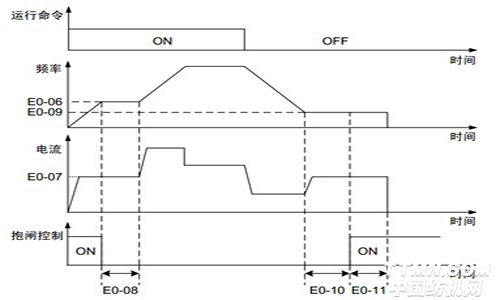 5. 适用于提升系统的抱闸控制,通过对驱动器内部输出电流和频率的精确控制避免绞车启动、停止时的溜车,同时还避免启动过流跳闸现象,控制图如下: