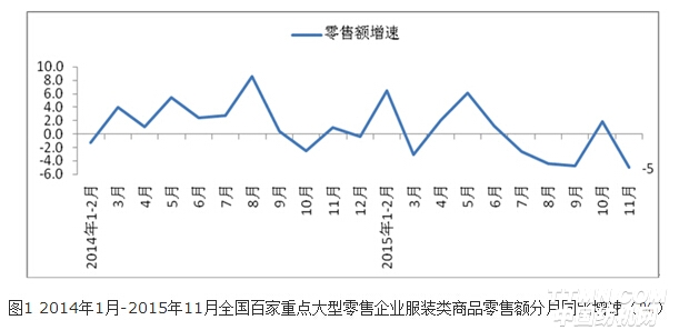 据中华全国商业信息中心的统计,2015年11月全国百家重点大型零售企业服装类商品零售额同比下降5.0%,是今年以来的最低月度增速,增速相比上年同期下降5.9个百分点,相比上月下降6.9个百分点。
