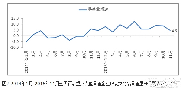 2015年11月,全国百家重点大型零售企业各类服装零售量同比增长4.5%,比上年同期下降1.5个百分点,比上月降低4个百分点。