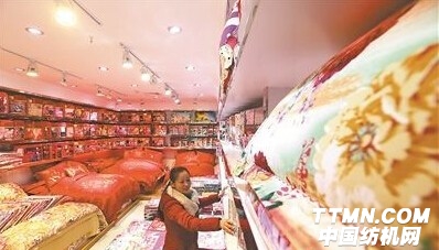 30日,海门工业园区管委会传出消息,2015年当地叠石桥家纺产品成交额达1000亿元,创历史最高纪录。图为当天,经营商户徐晓雅在叠石桥国际家纺城陈列床上用品。