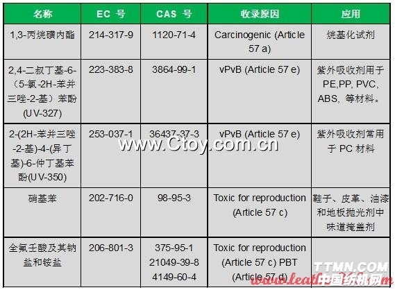 近日,欧盟ECHA新增五种物质,SVHCs物质清单从163项扩大到168项。新增的五种物质中,两种属于紫外吸收剂,广泛应用于PP,PVC,ABS等塑料材料中,一种属于全氟化合物,1,3-丙烷磺酸内酯的主要用途为烷基化试剂, 而硝基苯则常常添加在鞋子、皮革、油漆和地板抛光剂中掩盖味道。