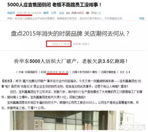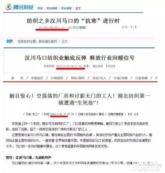 然而到了2016年的报道就成了这样的:湖北纺织名镇遭遇生死劫!大量企业倒闭,纺织企业主纷纷表示难熬,讨薪横幅随处可见。