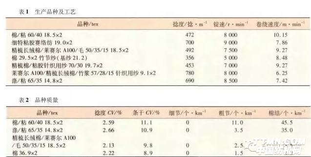 在使用TDN-128B型短纤倍捻机的几年中,我公司纺制了9.1tex×2~36.9tex×2股线。主要生产品种及工艺见表1。所有品种的质量均达到要求,空锭率为0,运转效率99%,好筒率99%,捻度CV在3%左右。部分品种质量见表2。