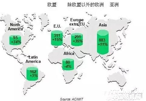 (2011年意大利纺机出口数据, 亚洲出口数量逐渐增多)