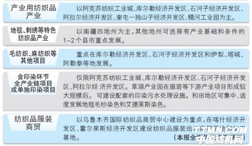 新疆重点支持阿克苏纺织工业城、石河子经济技术开发区、库尔勒经济技术开发区、阿拉尔经济技术开发区打造综合性纺织服装产业基地。在现有自治区园区中选择具有基础和条件的园区发展差别化的纺织服装及深加工产业。
