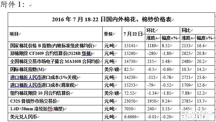国内棉花、棉纱价格大幅上涨 ——中国棉花市场周报(2016年7月18-22日)