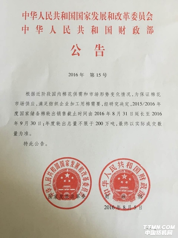 近日,国家发展改革委和财政部联合发布公告,根据近阶段国内棉花供需和市场形势变化情况,为保证棉花市场供应,满足纺织企业加工用棉需要,经研究决定,2015/2016年度国家储备棉轮出销售截止时间由2016年8月31日延长至2016年9月30日;年度轮出总量不限于200万吨,最终以实际成交数量为准。