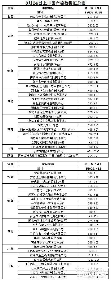8月24日两节共计轮出储备棉30062.0468吨。8月24日第一节销售储备棉15036.6348吨,其中国产棉15036.6348吨、进口棉0吨。8月24日第二节销售储备棉15025.412吨,其中国产棉15025.412吨、进口棉0吨。