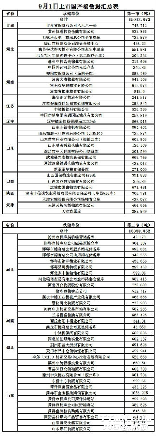 9月1日两节共计轮出储备棉30051.9250吨。9月1日第一节销售储备棉15013.0730吨,其中国产棉15013.0730吨、进口棉0吨。9月1日第二节销售储备棉15038.8520吨,其中国产棉15038.8520吨、进口棉0吨。
