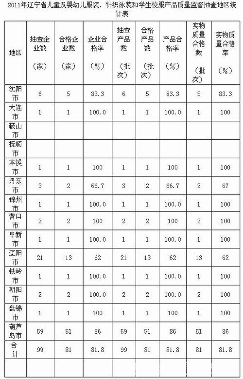 根据2011年监督抽查工作的安排,辽宁省质量技术监督局组织有关检验单位,对辽宁省儿童及婴幼儿服装、针织泳装和学生校服3种产品进行了省级监督抽查。现将有关情况通报如下: