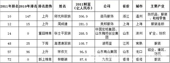 2011福布斯中国富豪榜纺织服装类榜单