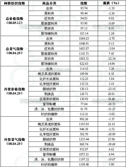 柯桥纺织指数说明: ①该指数是由一系列分项指数构成的完整的指数体系,包括价格指数、景气指数和外贸指数三部分。分商品类别、分监测指标,从不同层次,不同方面来全面反映柯桥轻纺城市场及相关产业的发展变化情况...